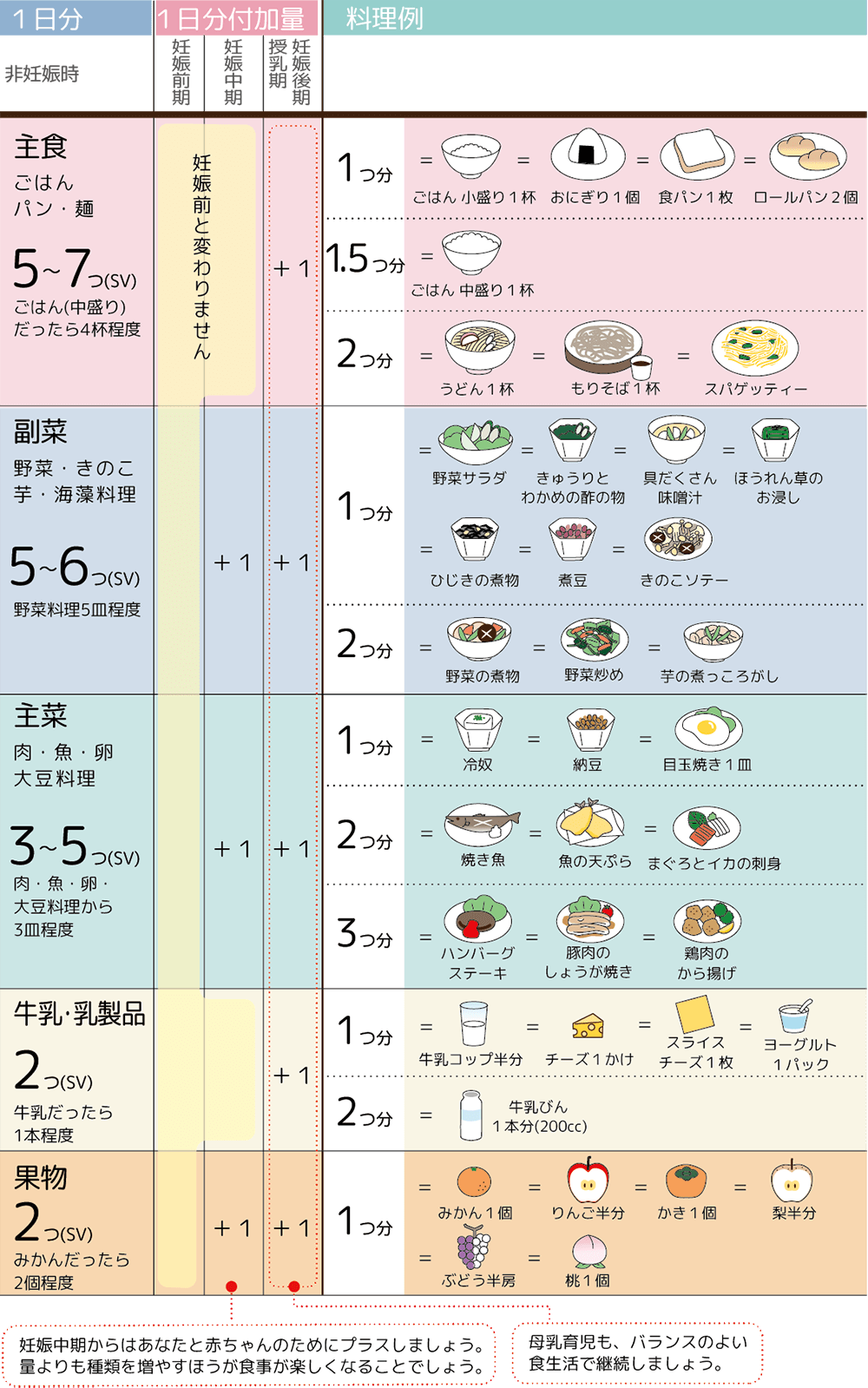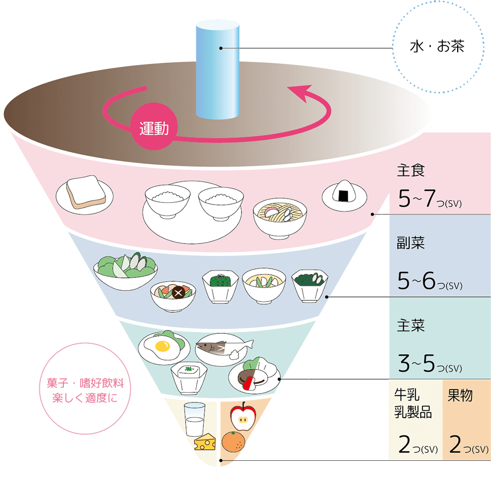 - 1日に「何を」「どれだけ」食べたらよいかがひと目でわかる食事の目安です。「主食」、「副菜」、「主菜」、「牛乳・乳製品」、「果物」の5グループの料理や食品を組み合わせてとれるよう、コマにたとえてそれぞれの適量をイラストで示しています。