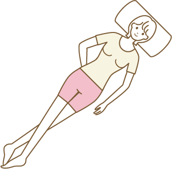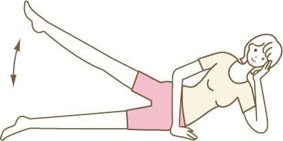 ひじをついて横向きに寝る。背すじを伸ばしてからだが一直線になるように気をつける。足首に力を入れてまっすぐ上げ下ろしする。左右交互に。