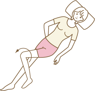 枕をしてあおむけになり、片方のひざを立てて、足の裏を床につける。立てたひざをゆっくりと内側と外側に倒す。左右の足を交互に。